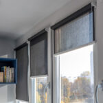 Широкие серые рулонные шторы в спальне